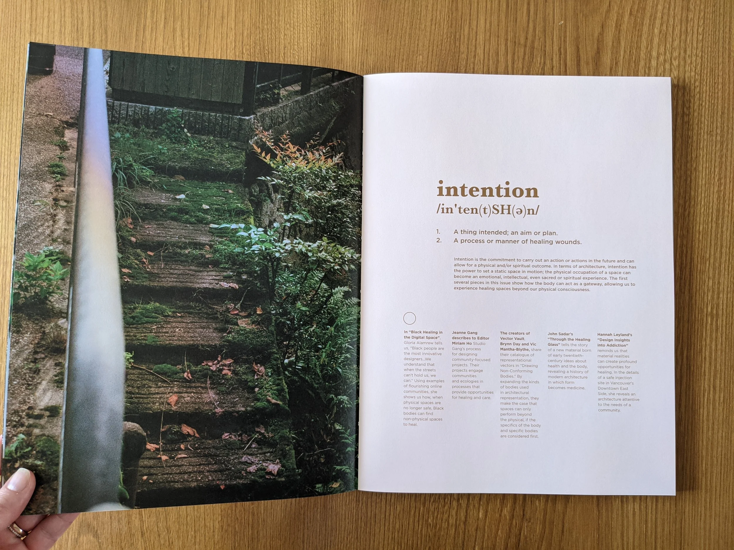 As you explore the research, essays, fictions, and design projects featured in this issue, you will notice that none directly address COVID-19, although many pieces discuss issues that have run in parallel with the pandemic. COVID-19, we thought, would offer a lens limited by current events on a theme that we see as foundational. So instead, the discussions focus on topics that have overlapped with a need for healing for quite some time: race, gender, inclusion, decolonization, public and digital spaces, addiction, spirituality, economic exploitation, and ecological destruction. These are some of the topics that will be addressed regularly in our forthcoming series.